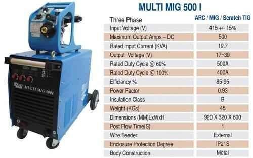 The Stamp Bridge MULTI MIG 500I 415V Three Phase MIG Welding Machine is a top quality welding machine that is perfect for a wide range of applications. With its three phase power, it is able to weld thicker materials with ease, and its 500 amp output means that it can handle even the most challenging projects. This product is a MIG Welding Machine from Stamp Bridge. It has a weight of 45 kg, and is 85 – 95% efficient. Additionally, it is Class B, has dimensions of 920x320x600 mm, and has a power factor of 0.93. Finally, this product has a voltage of 415 V and an output of 17 – 39 V. With a rated input current of 19.7 KVA, it can handle even the most challenging projects. And, with a three phase design, it is perfect for use in any shop or garage.